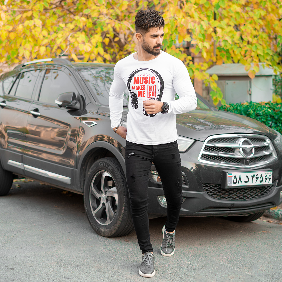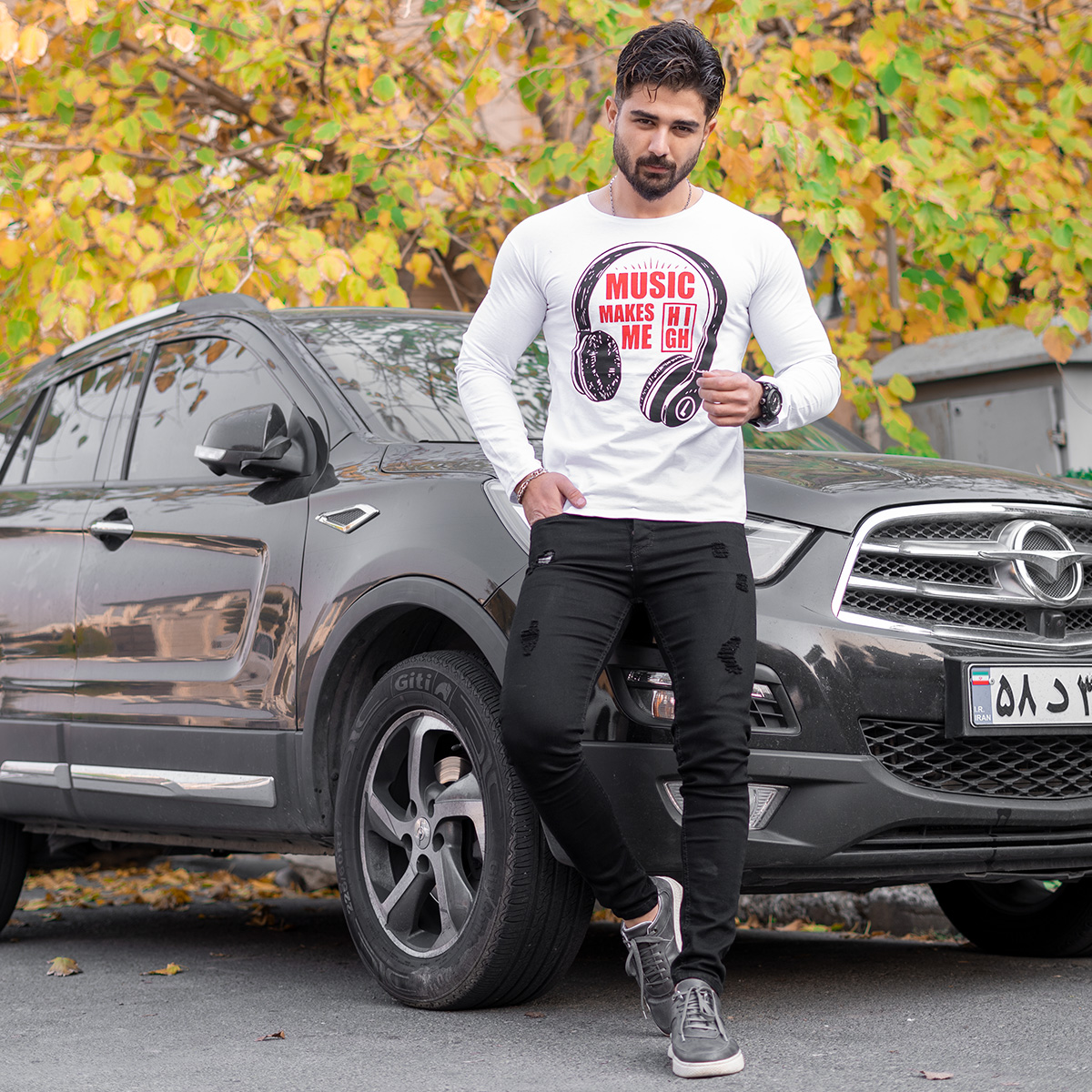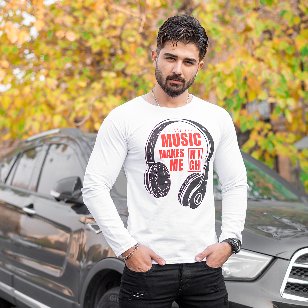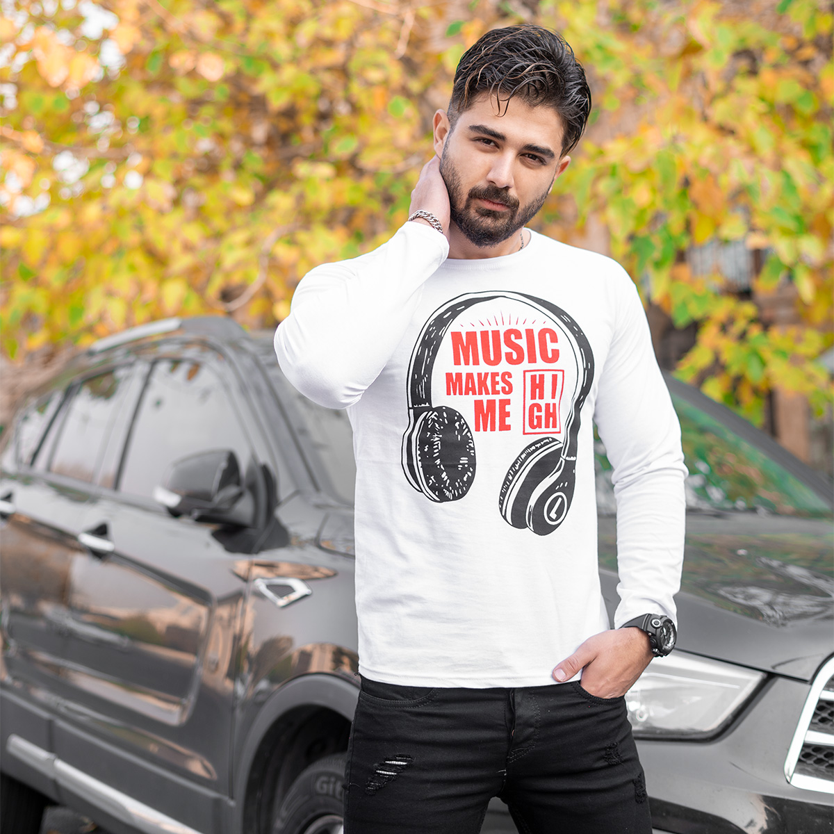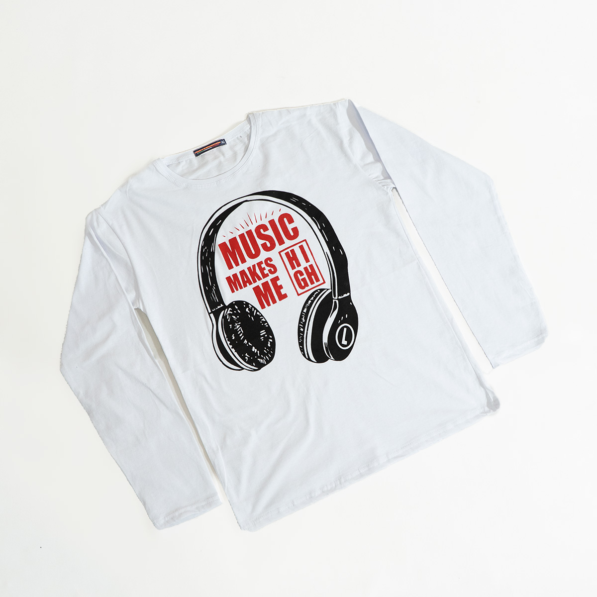 تیشرت آستین بلند مردانه طرح هدست سفید مدل O22