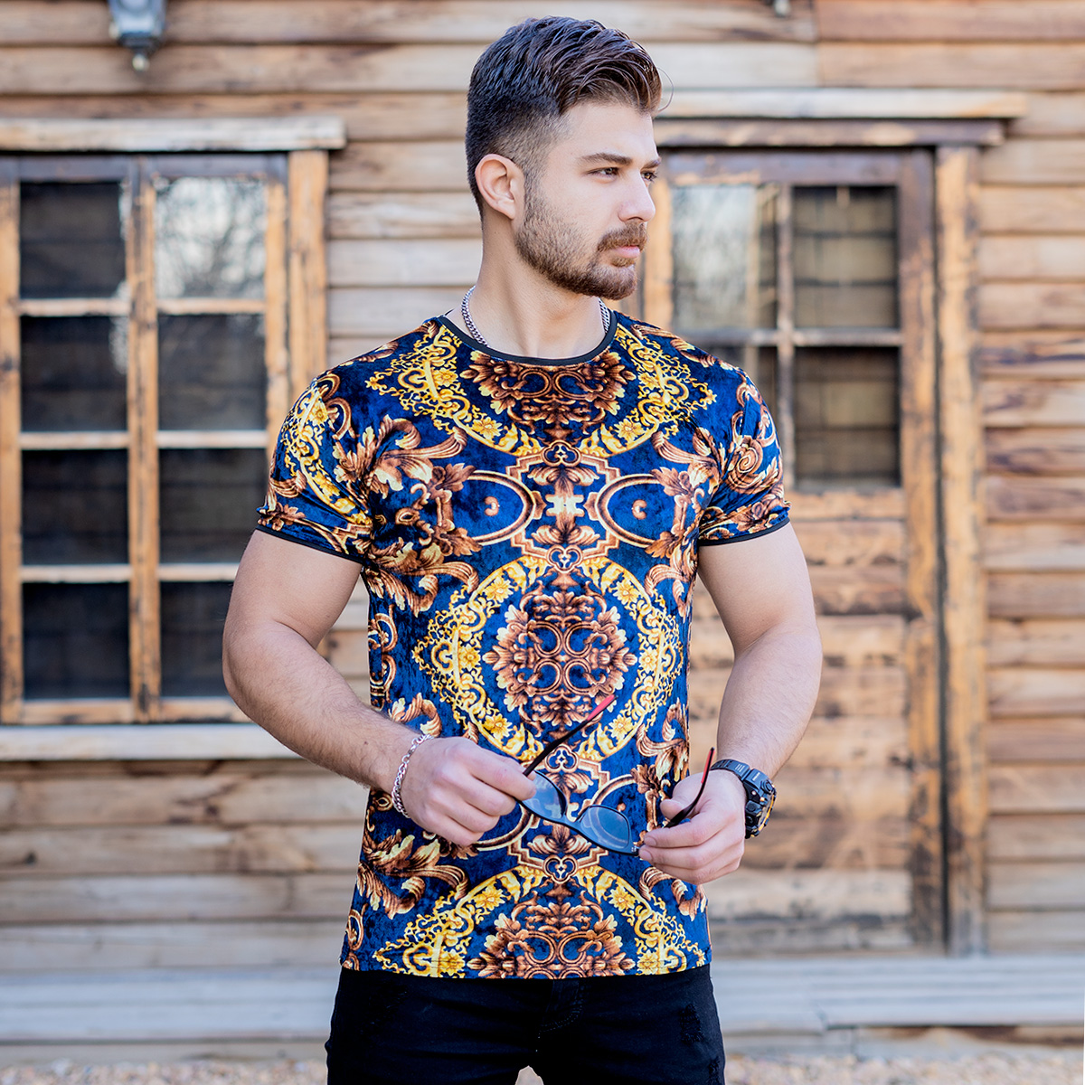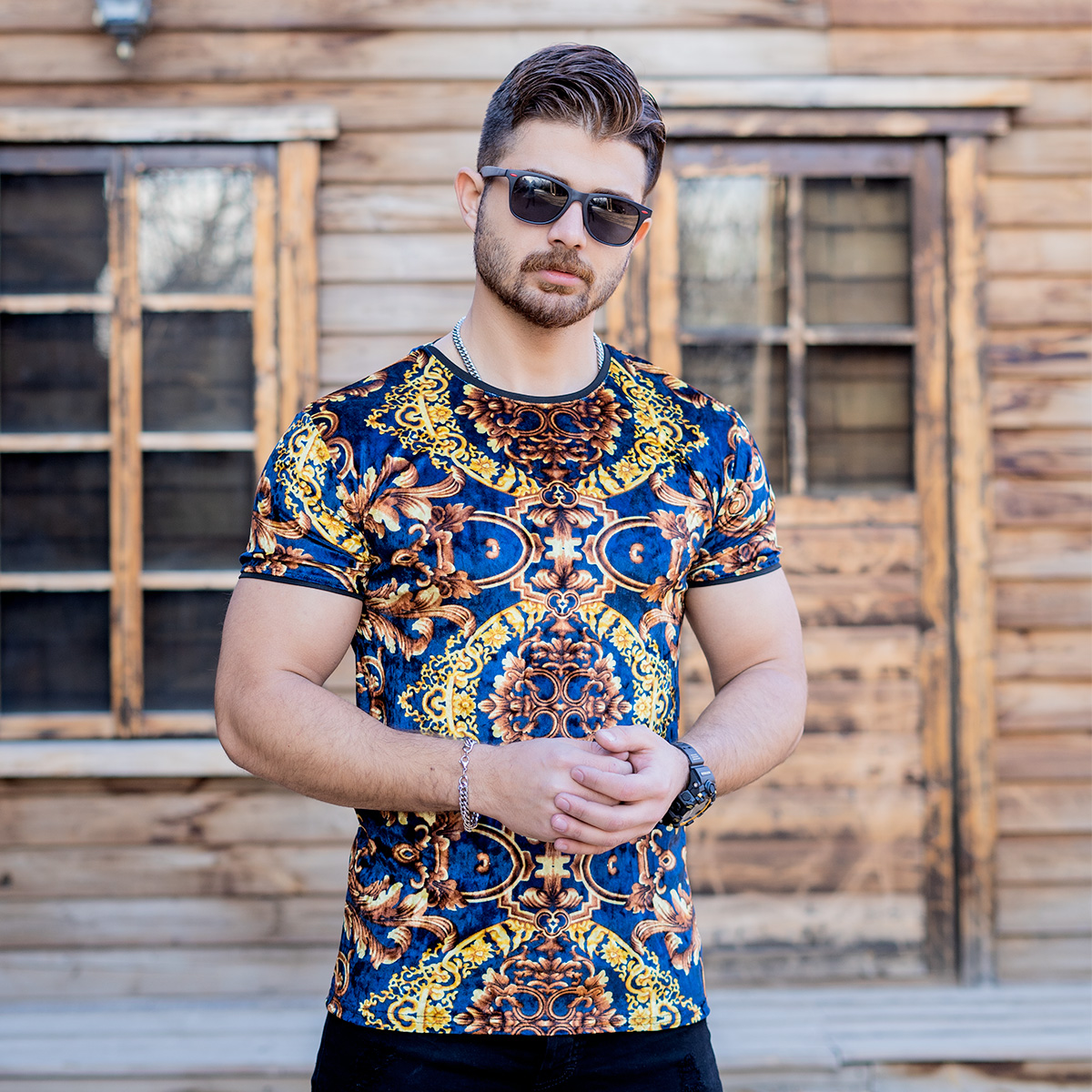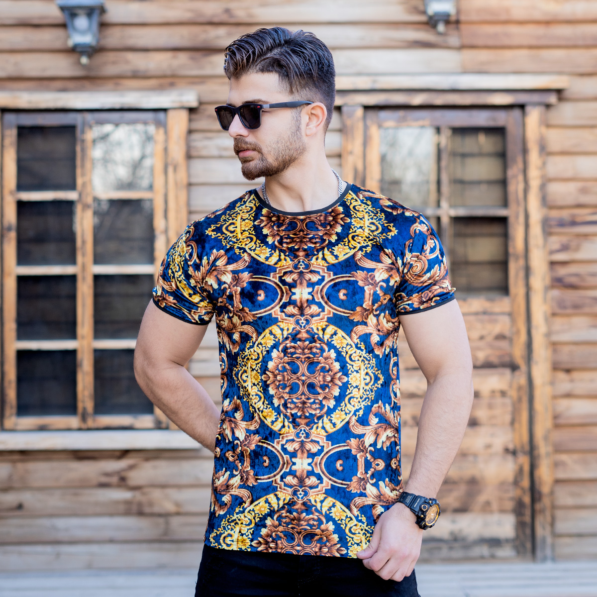 تیشرت مخمل آبی طرحدار مردانه مدل Avin