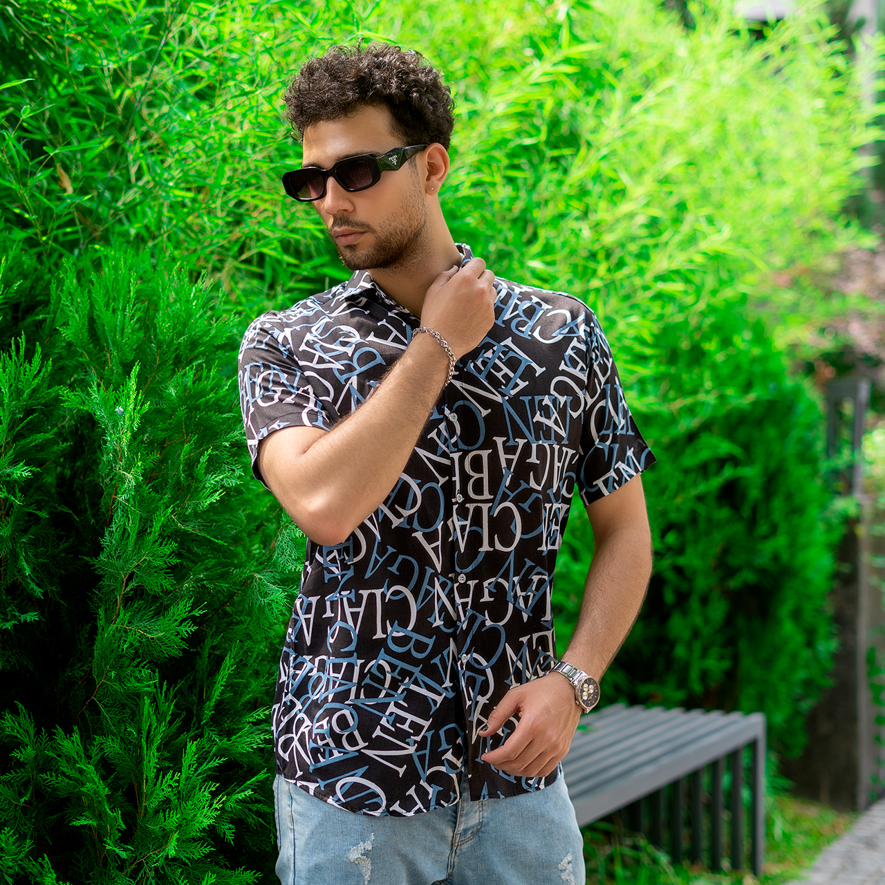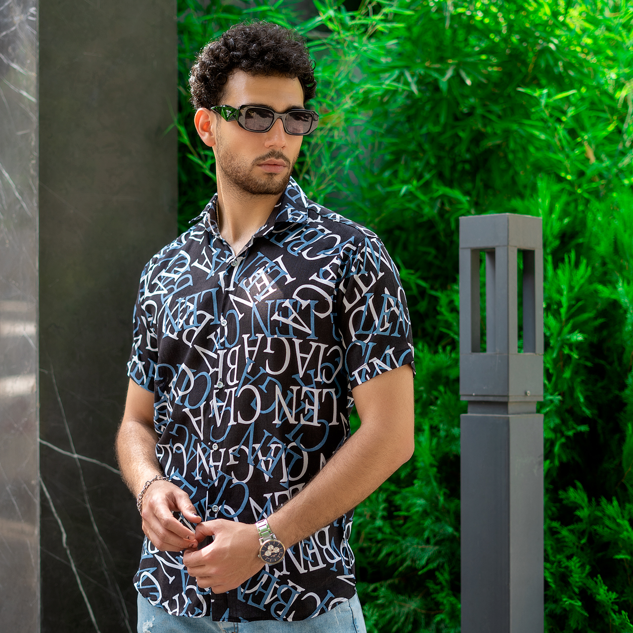 پیراهن هاوایی مردانه مشکی آبی مدل ABC