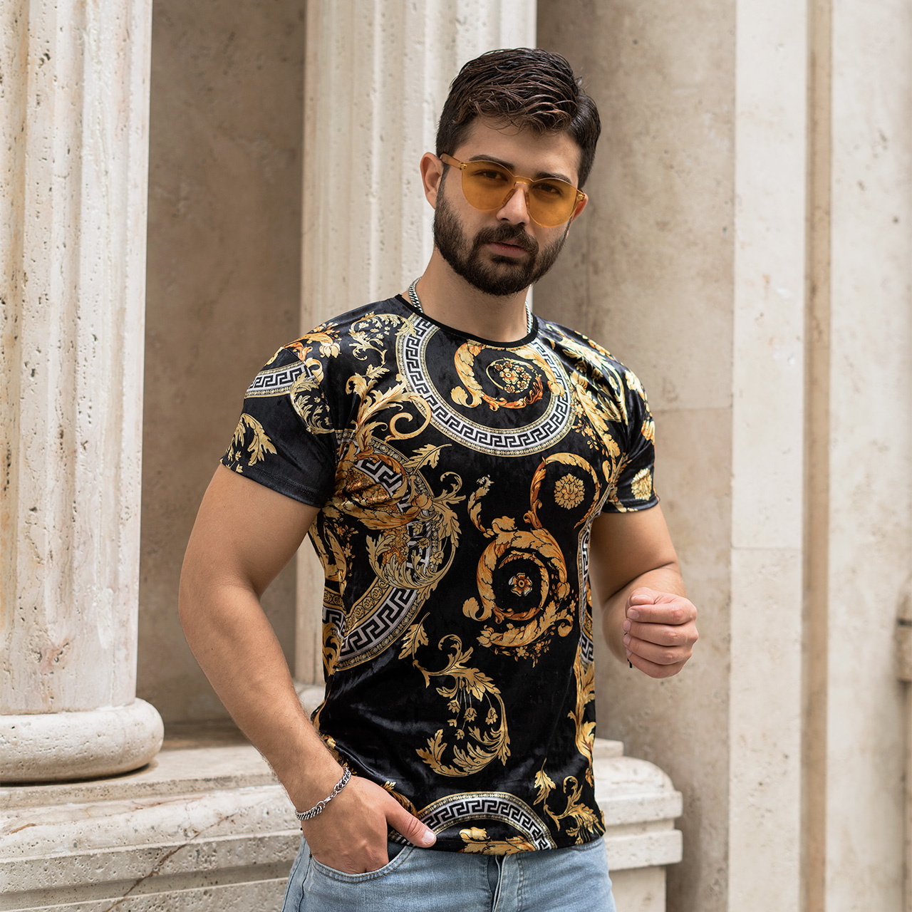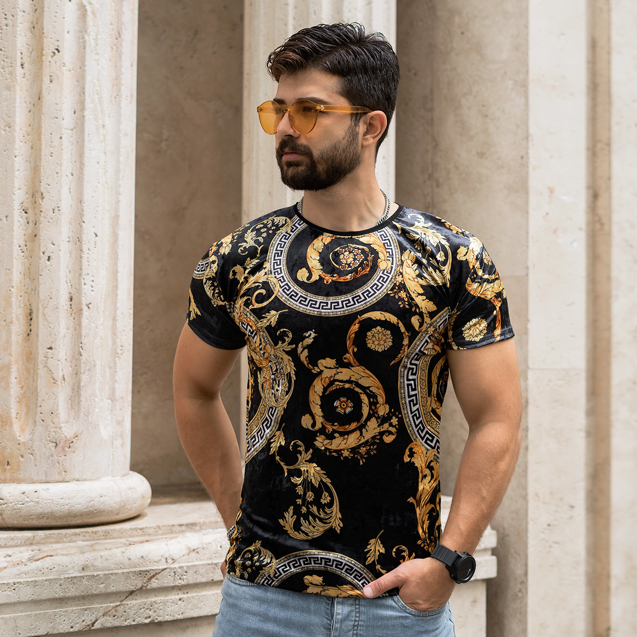 تیشرت مخمل مشکی طلایی ورساچه مردانه مدل 66