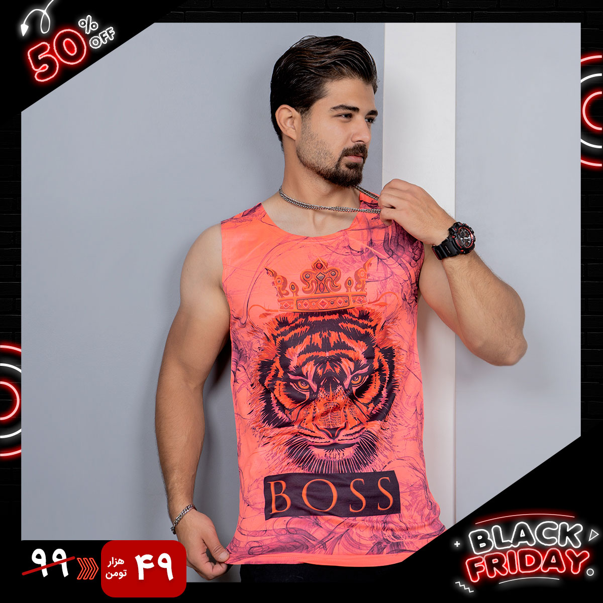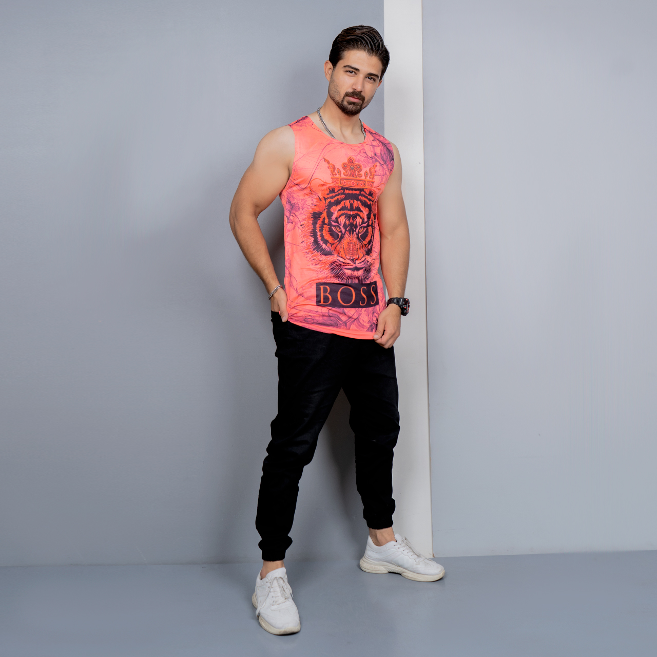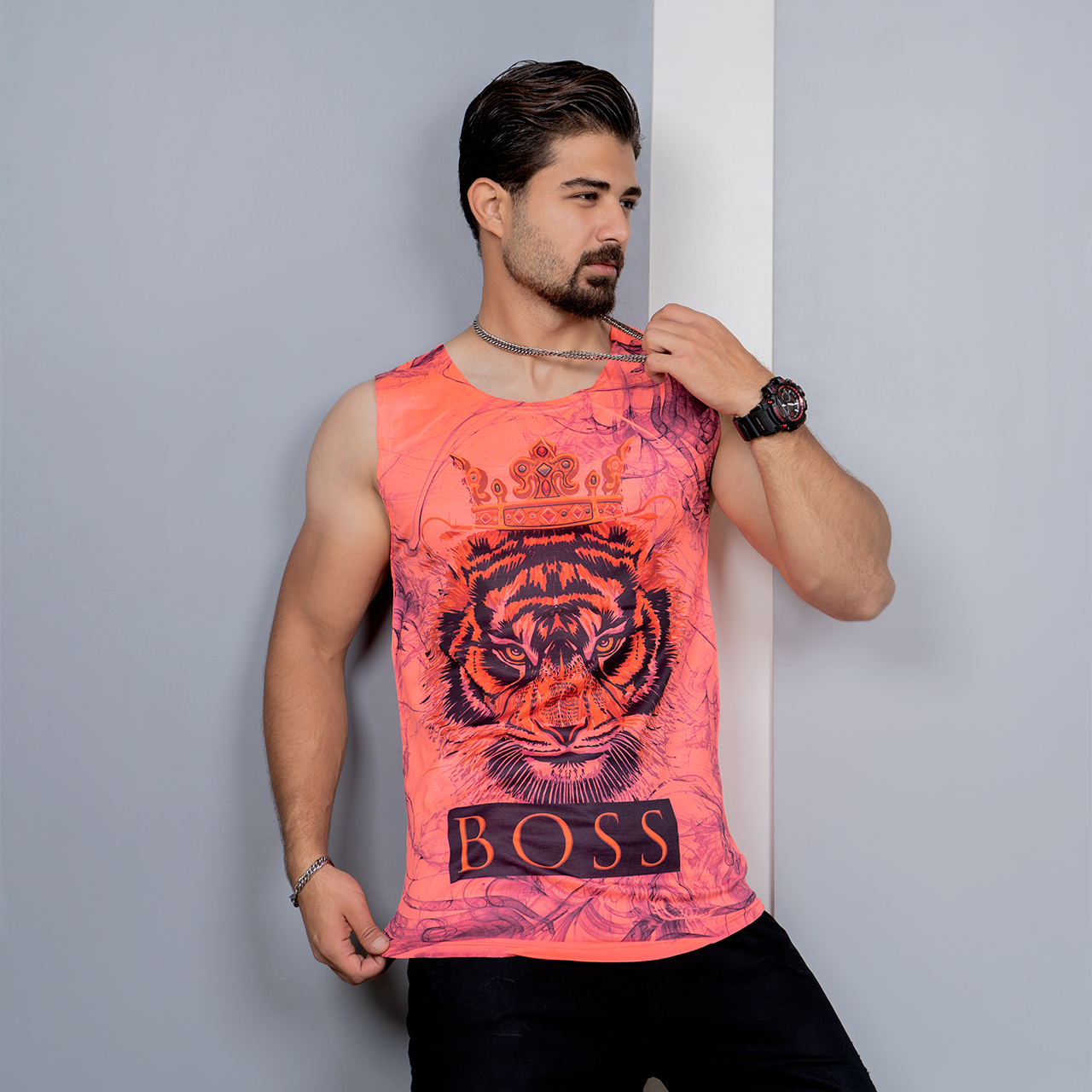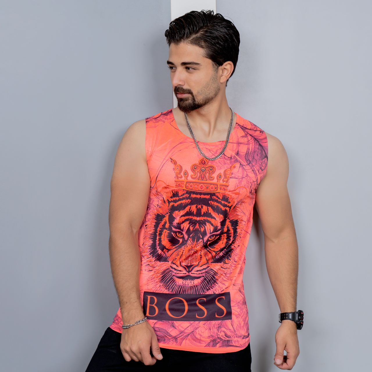 رکابی (T) صورتی طرح ببر مردانه مدل Boss