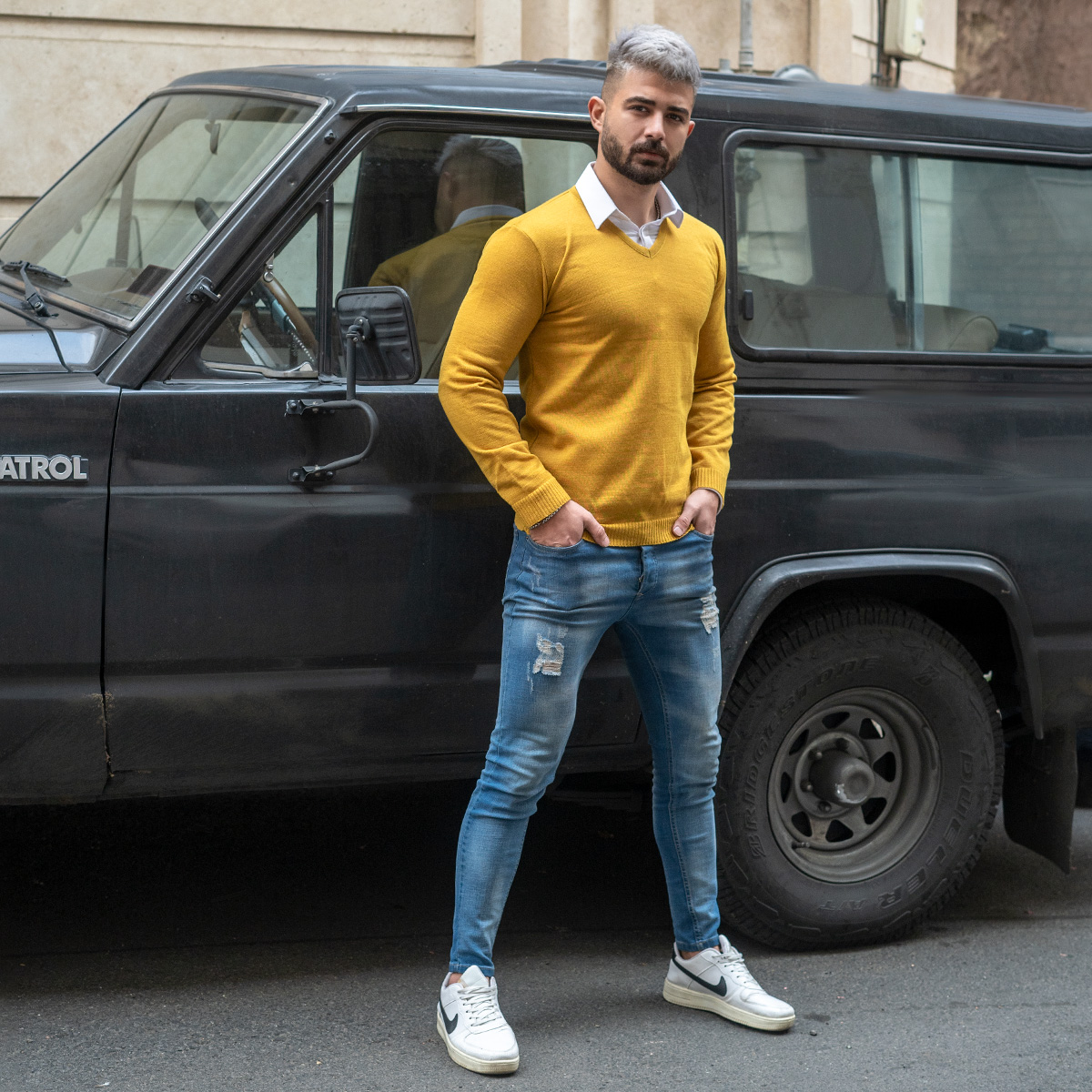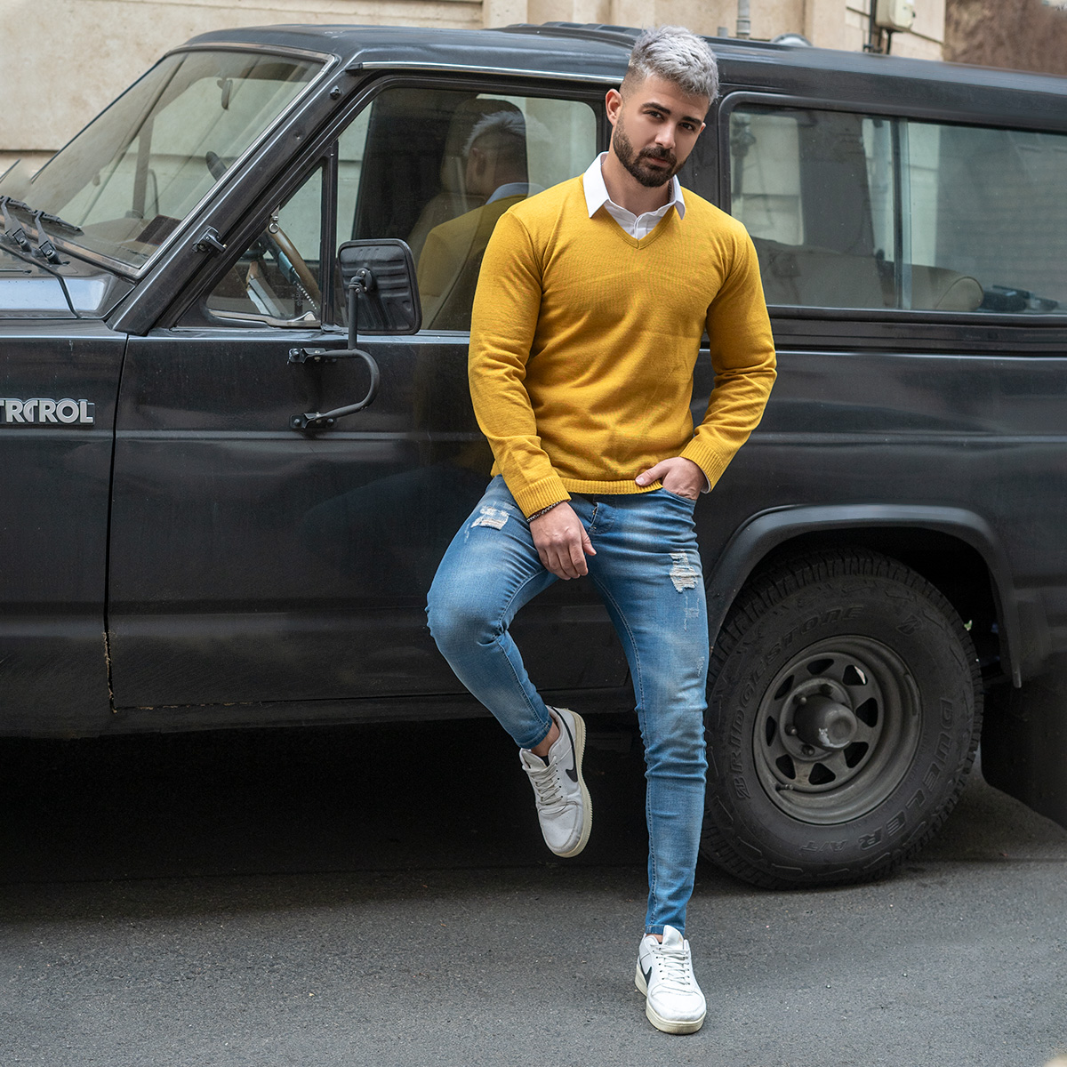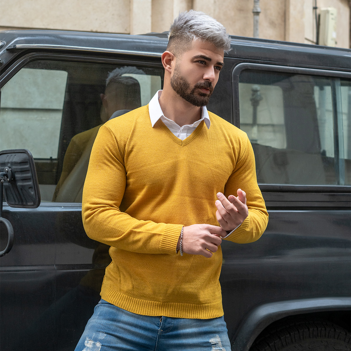 پلیوربافت یقه هفت خردلی مردانه مدل sorosh