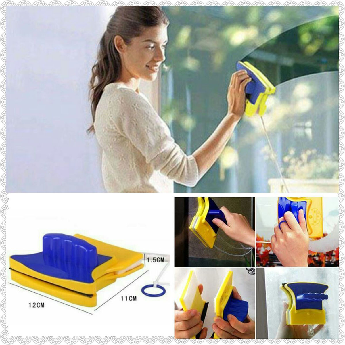 این شیشه پاک کن دارای دو قسمت اهنربایی می باشد که با گرفتن یکی از آنها در یک طرف شیشه قسمت دیگر هم در آن طرف شیشه بوسیله آهنربا به سمت قسمت اول جذب شده و در نتیجه بر روی شیشه میماند و با حرکت دادن قسمت اول شیشه پاکن قسمت دوم نیز در ان طرف شیشه به حرکت در امده و همزمان هر دو طرف شیشه پاک و تمیز می شود!