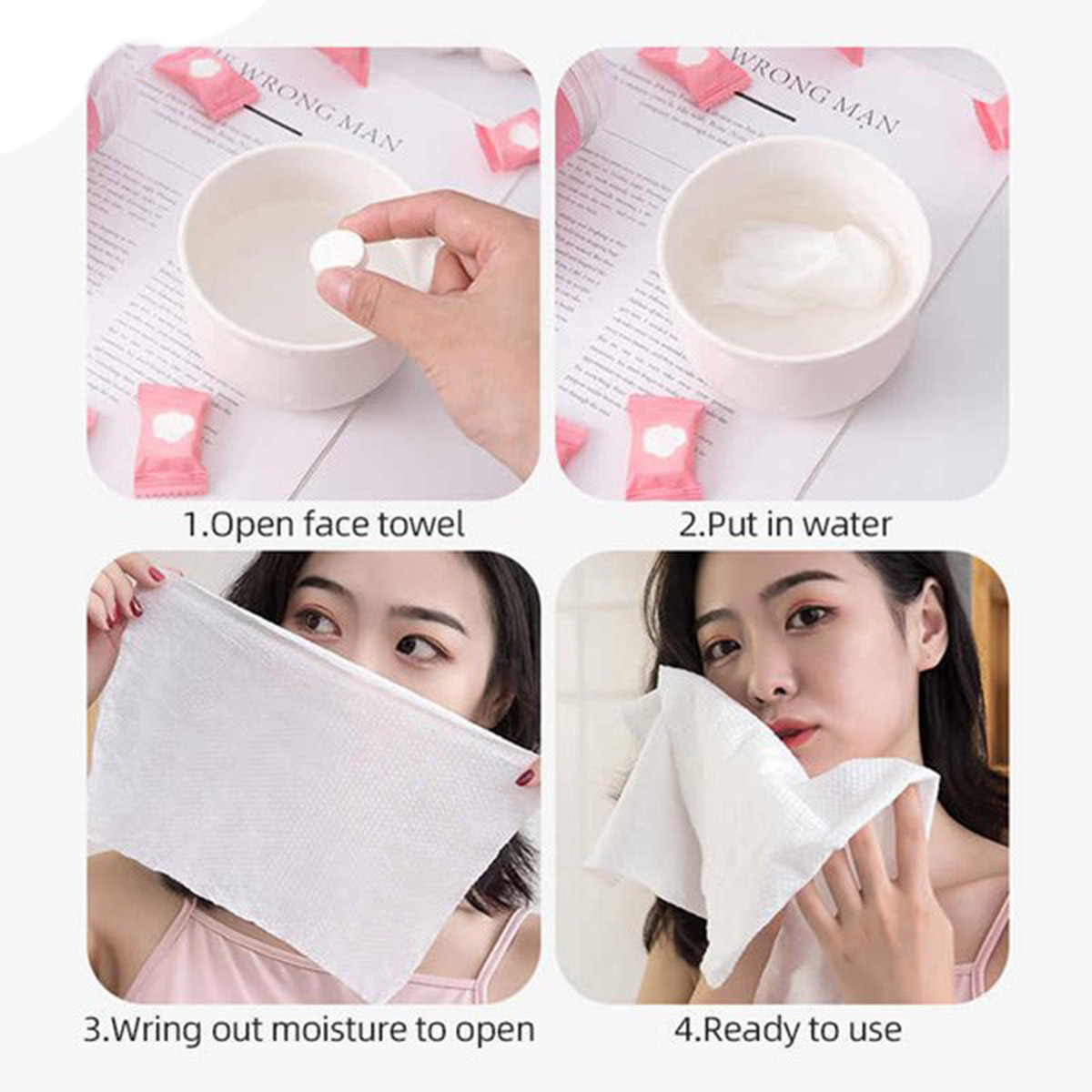 به هنگام خیس شدن باز شده و به دستمالی به ابعاد ۲۲x۲۰ تبدیل میشود.