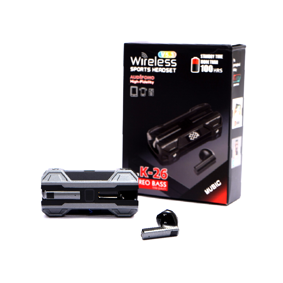هندزفری بلوتوثی مدل K-26 یک هندزفری زیبا و الهام گرفته از کاراکتر های ترنسفورمرز میباشد..همچنین بدلیل استفاده از میکروفن های قدرتمند و خساس گزینه مناسبی برای مکالمه میباشد.طراحی این هدست بگونه ای است که با قراد دادن ایرپاد ها درون خشاب محفظه شارژ بسرعت در جای خود قرار میگیرند که البته دلیل آن مگنتی بودن ایرپاد است..این هدست در عرض یک ساعت و نیم کاملا شارژ میشود و هر بار شارژ محفظه میتواند بارها ایرپاد رو شارژ کند.ایرپاد ها بسته به میزان صدا حدودا یک ساعت میتوانند کارایی داشته باشند.