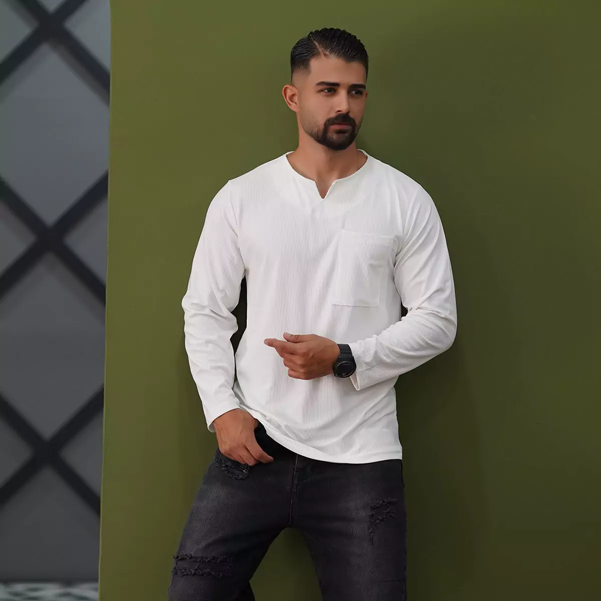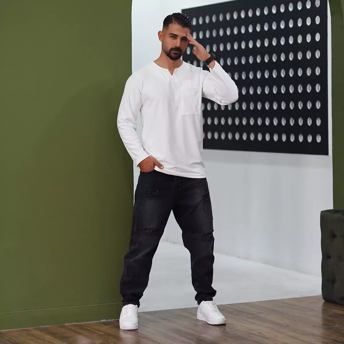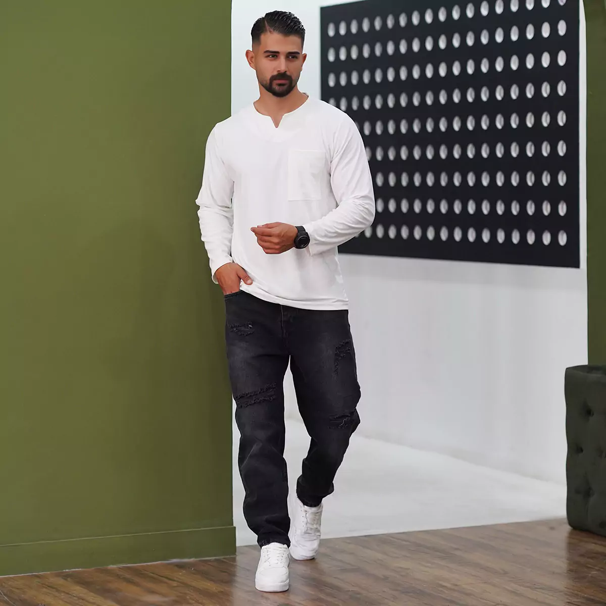 تیشرت آستین بلند یقه کوبایی سفید مردانه مدل Asam