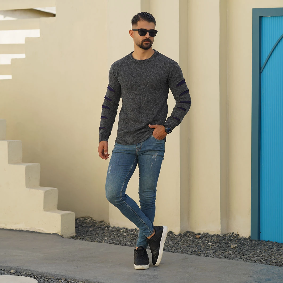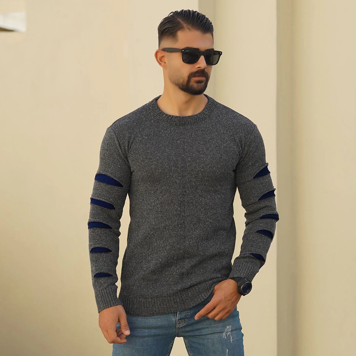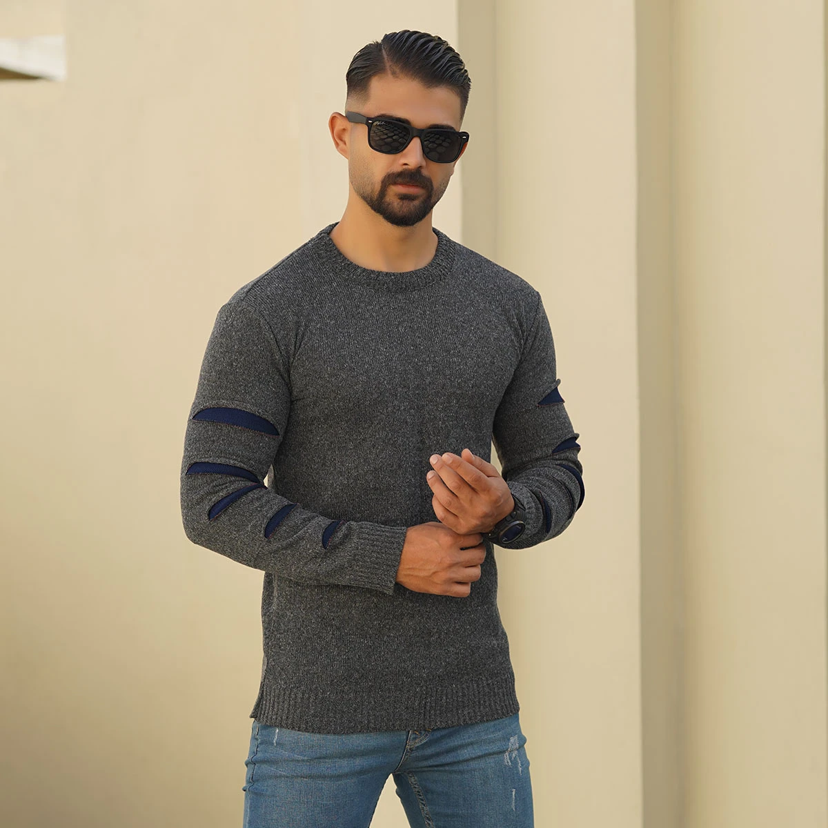 پلیور مردانه یقه گرد ذغالی سرمه ای مدل Q20