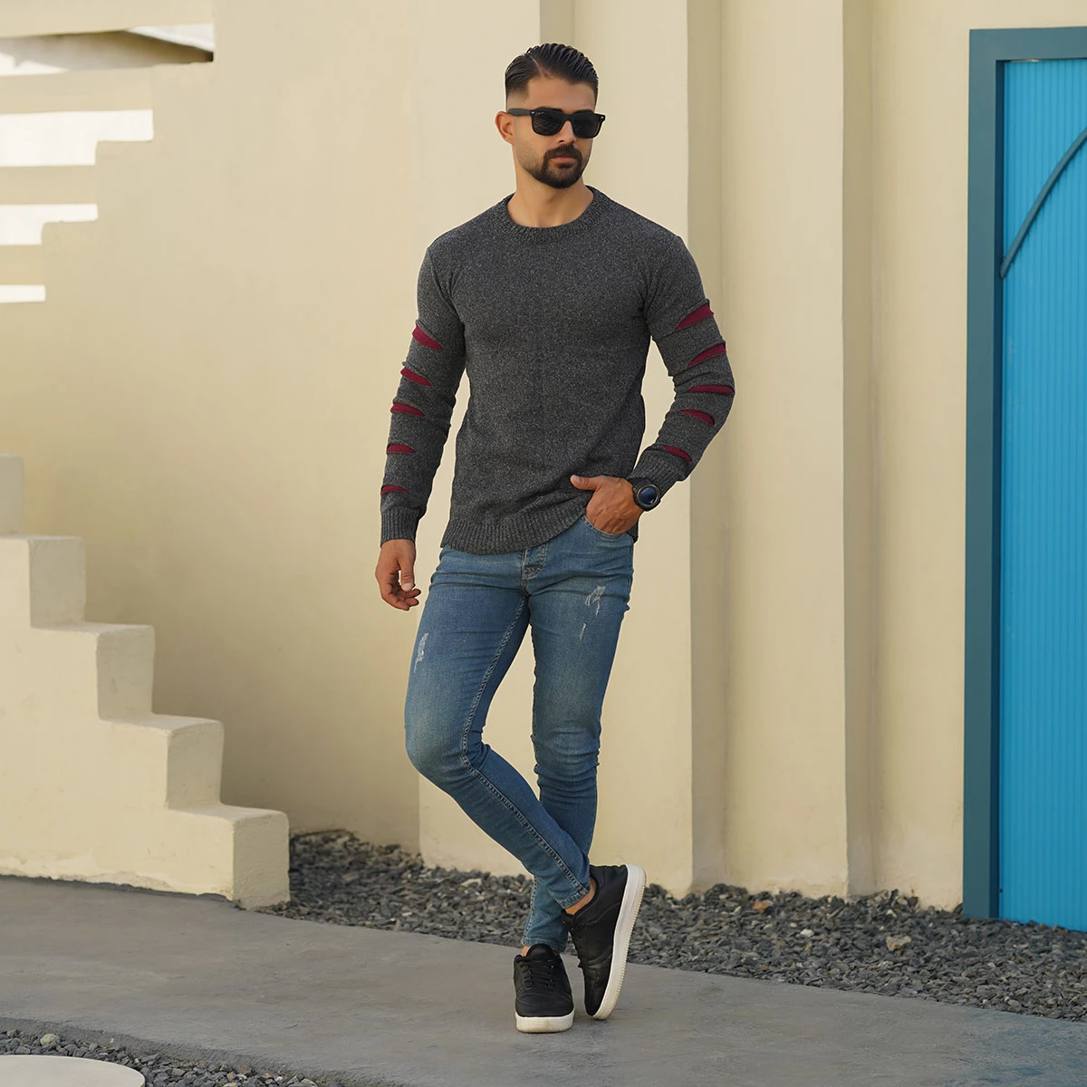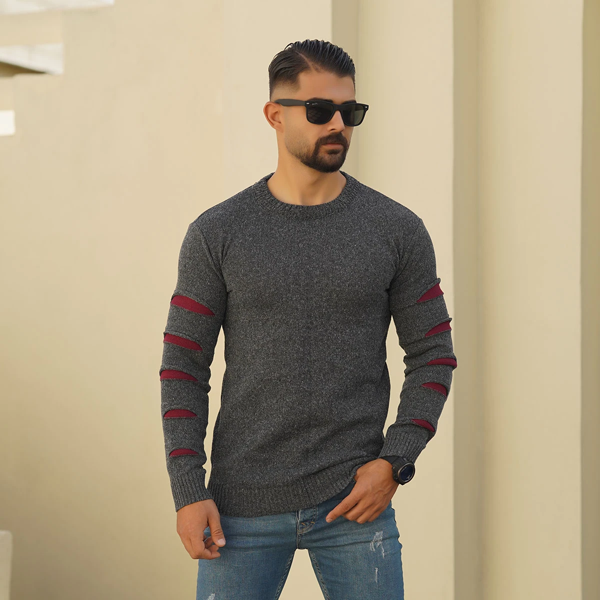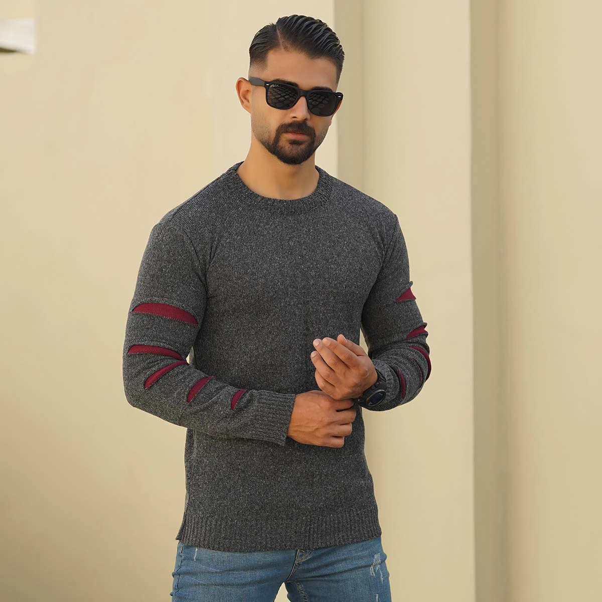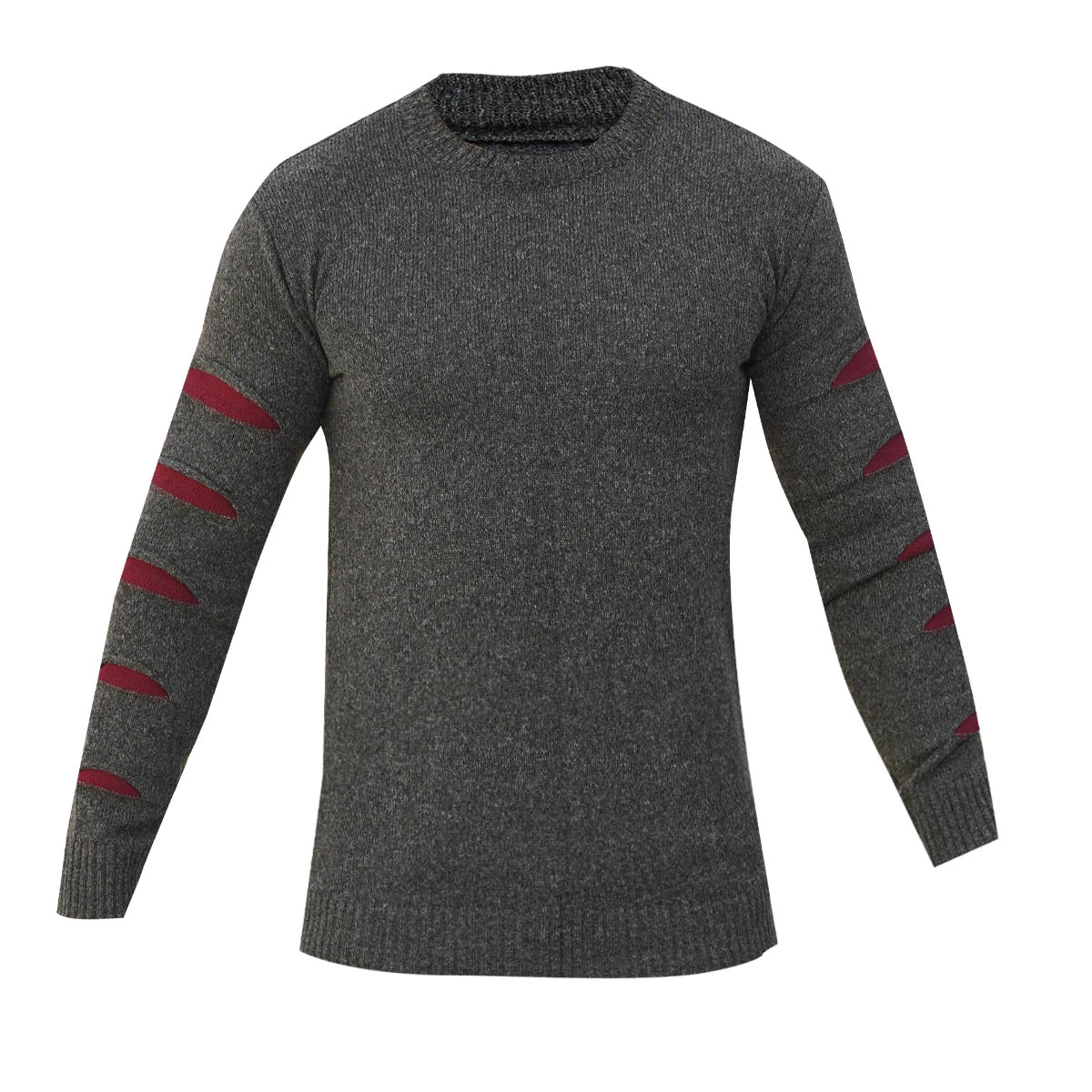 پلیور مردانه یقه گرد ذغالی زرشکی مدل Q20