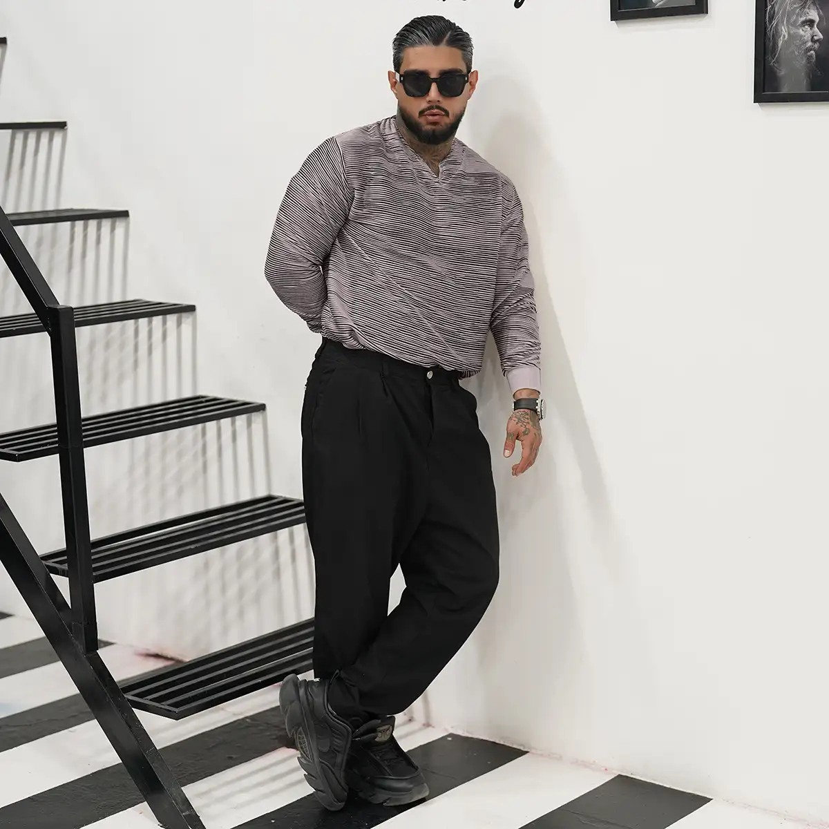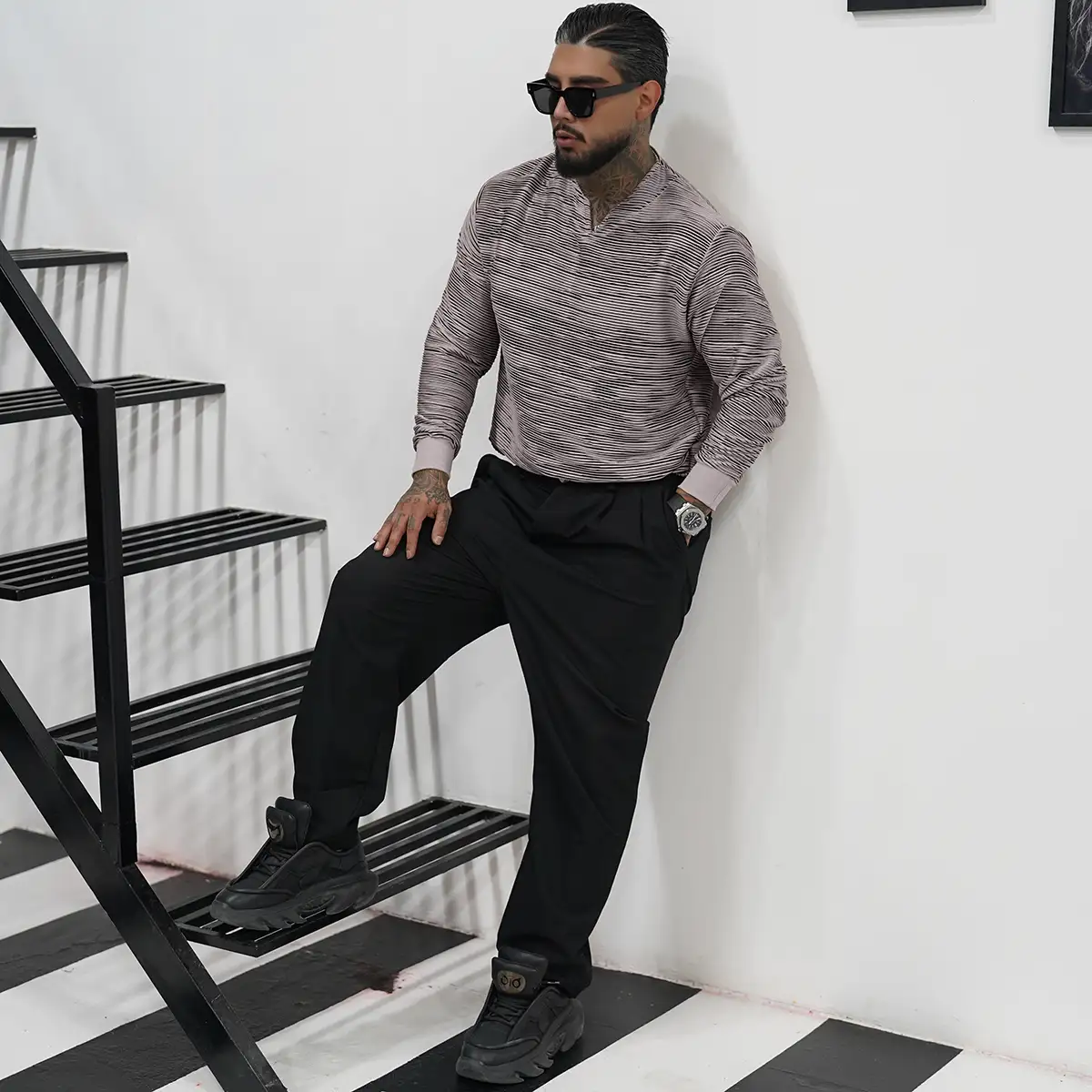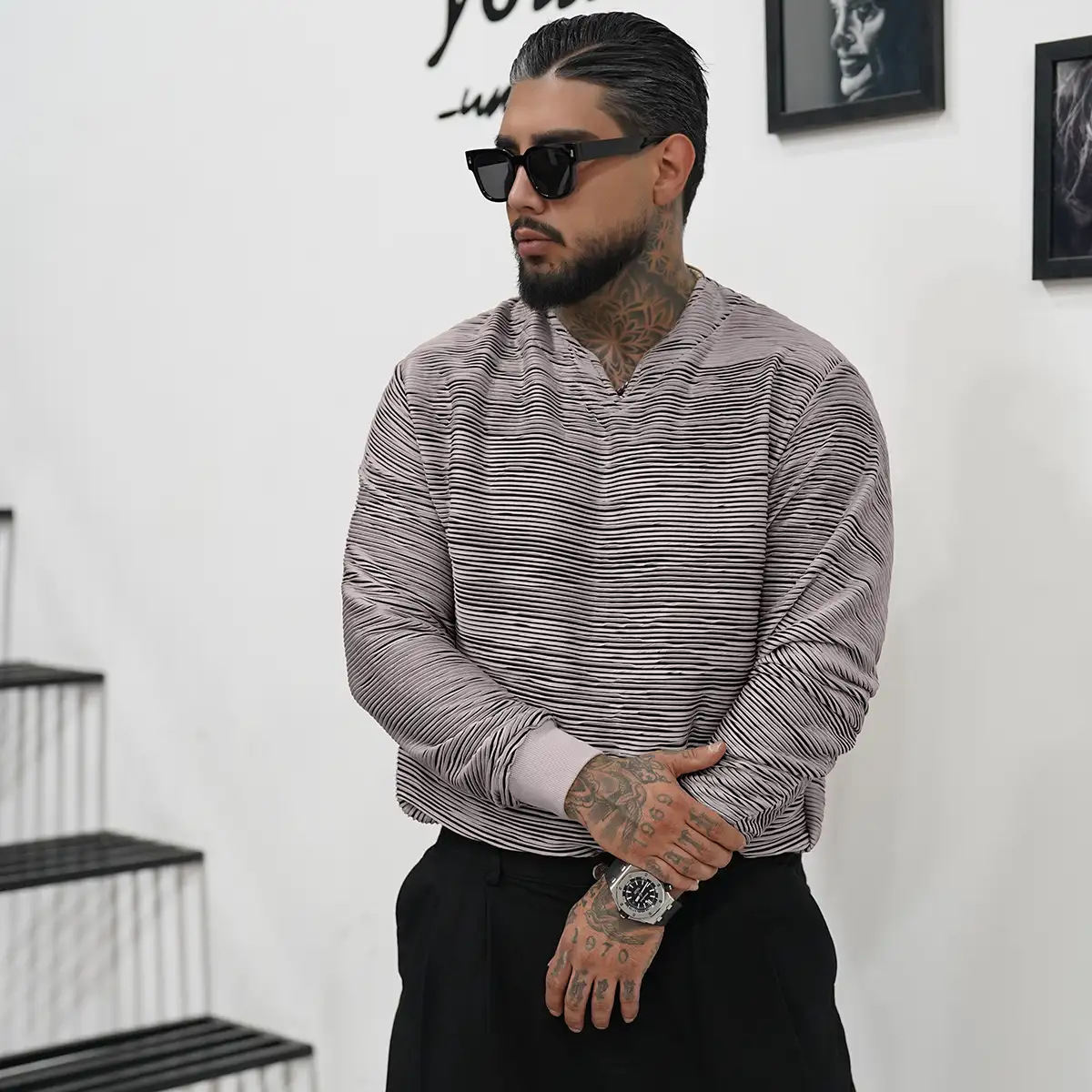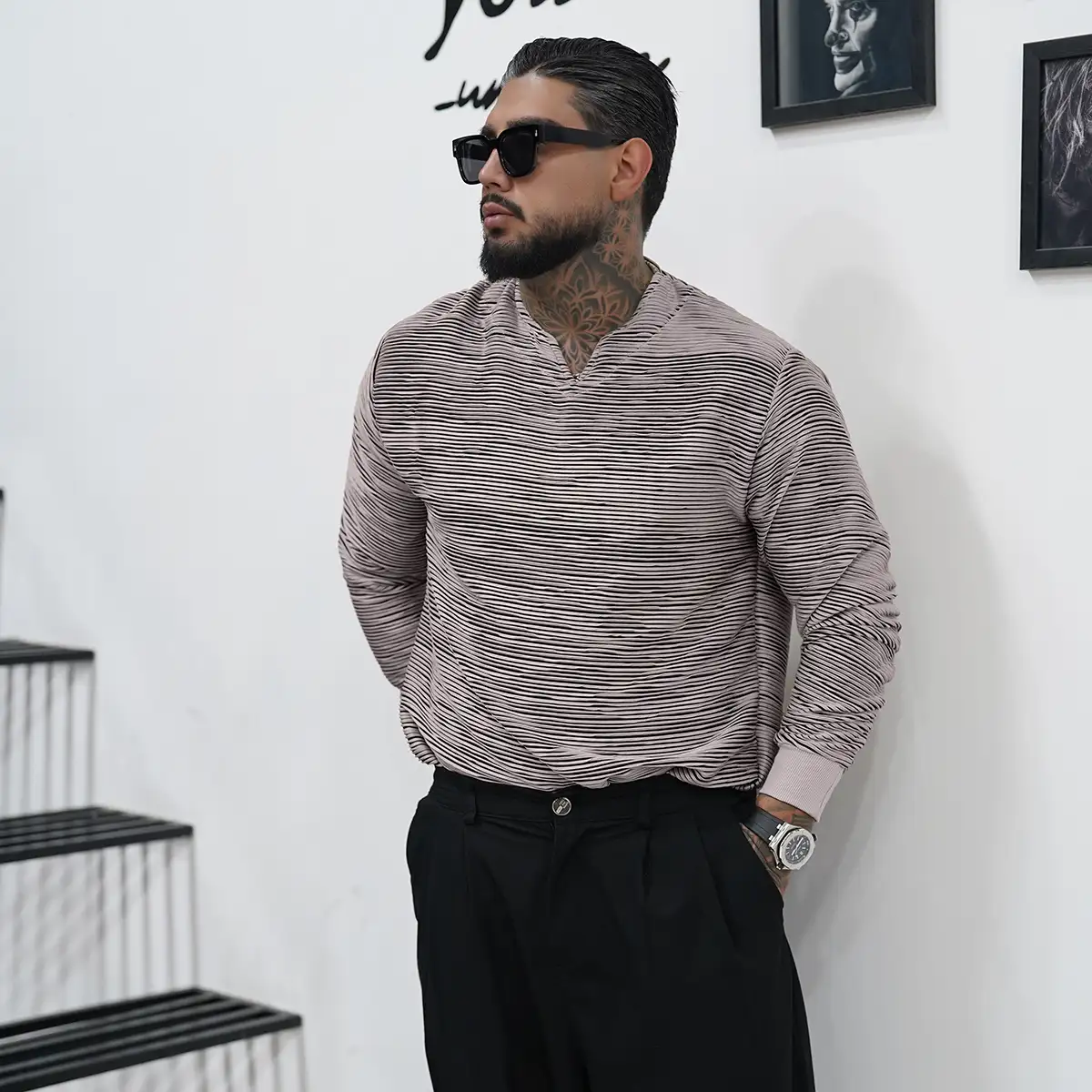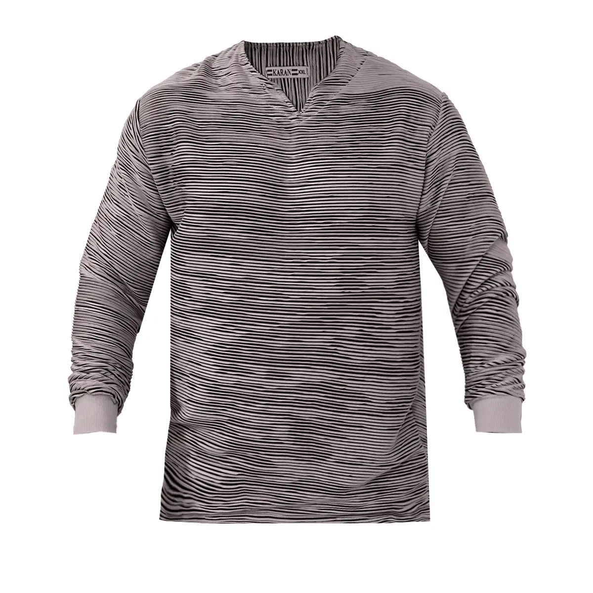 تیشرت آستین بلند یقه کوبایی طوسی تیره مدل Nivad
