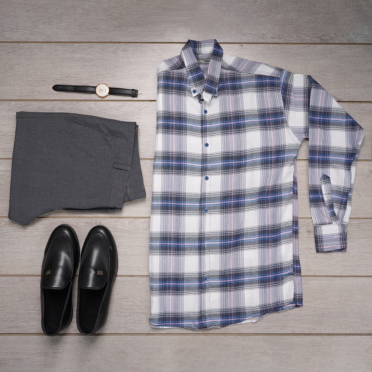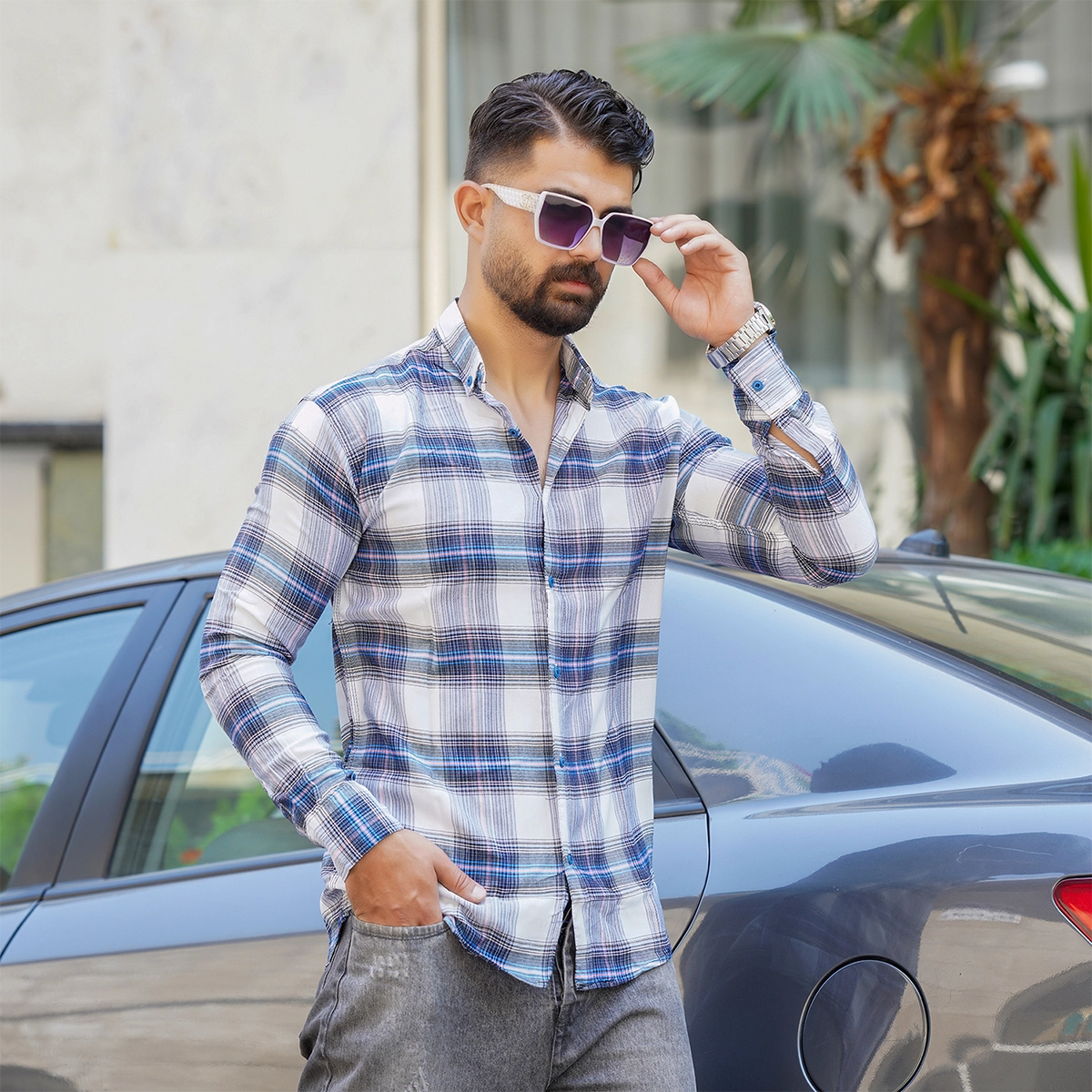 پیراهن چهارخونه آبی سفید مردانه مدل Sany