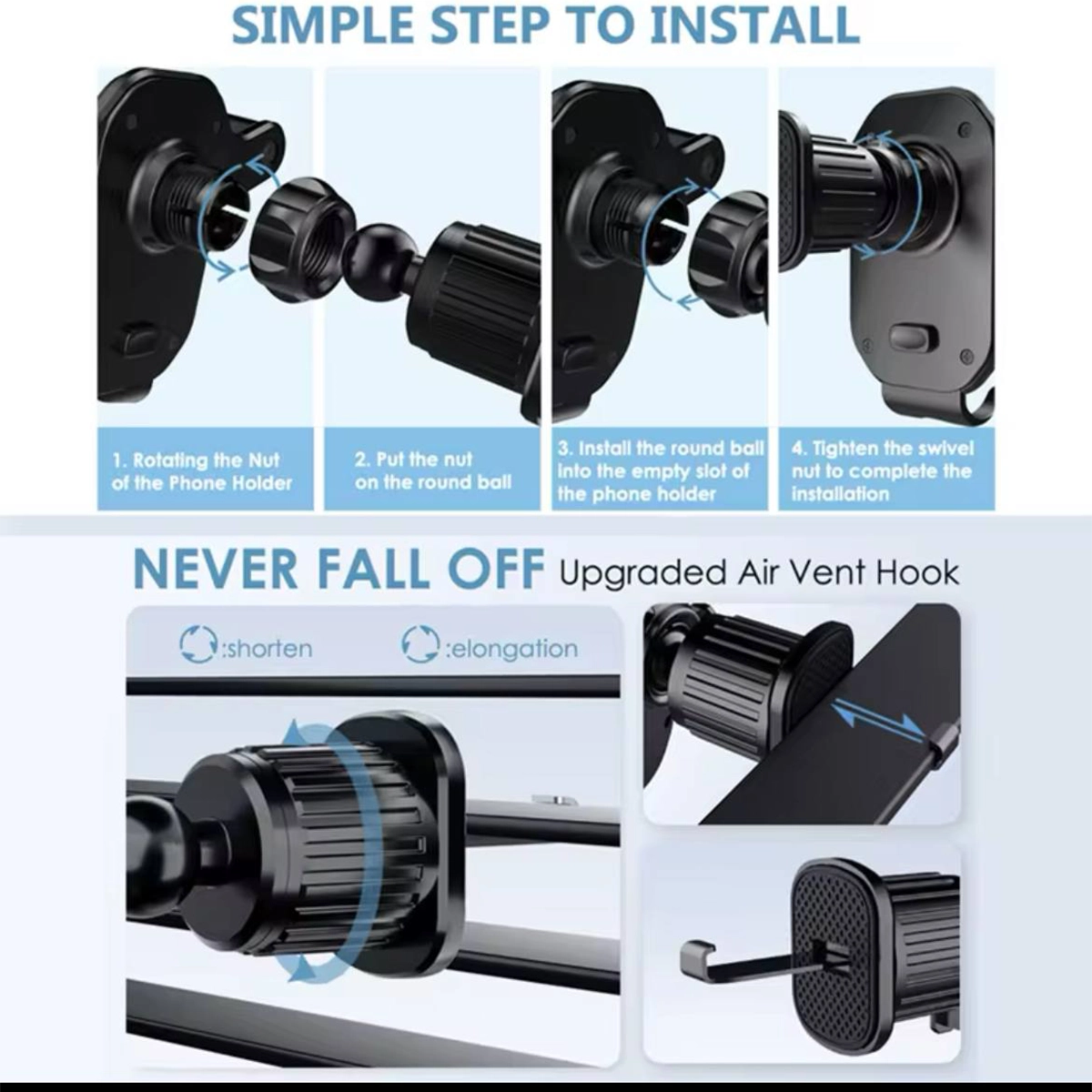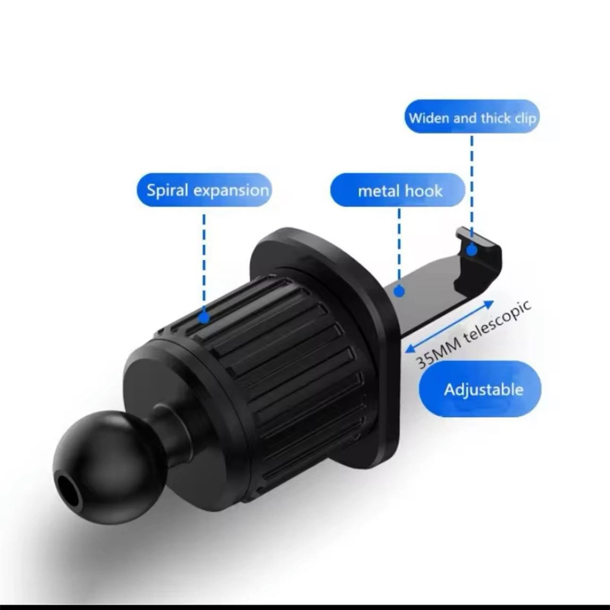 طراحی این هولدر برای نصب در دریچه خودرو بوده و با استفاده از گیرهای که دارد به راحتی در دریچه هوای خودرو نصب میشود. سه بازوی در اطراف آن قرار گرفته و با ایجاد حالتی مثلثی شکل گوشی را کاملا محکم در خود نگه میدارد و مانع افتادن آن میشود. سر بازوها با پوششی از پلاستیک نرم پوشیده شده تا موبایل را در طول سفر ثابت و محکم نگه دارد.