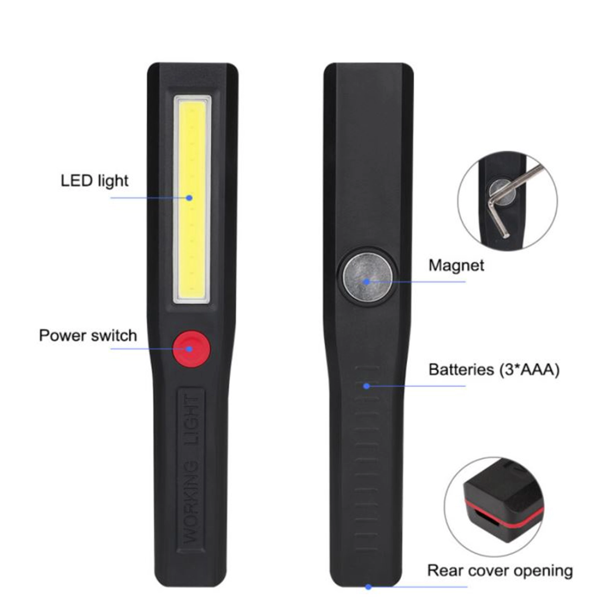 چراغ قوه مگنتی پرنور آهنربایی که از طریق 3 عدد باتری نیم قلمی تغذیه می شود و به دلیل وزن کم و کوچک بودن مناسب برای خانه ، محل کار ، کمپ ، مسافرت و کوهنوردی است. این محصول دارای آهنربایی در پشت خود است که به راحتی می توانید آن را به هر جای فلزی متصل نمایید تا نور خود را به محل مورد نظر بتاباند. همچنین با انتخاب گزینه چند رنگ ترکیبی از رنگ کلید و نوار دور محصول که در تصویر اول میباشد خدمتتان ارسال می گردد و رنگ اصلی بدنه محصول مشکی با نور سفید است.همچنین با قابلیت انتخاب نور ثابت یا چشمک زن ، میتوانید از محصول برای اعلام خطر نیز استفاده نمایید.