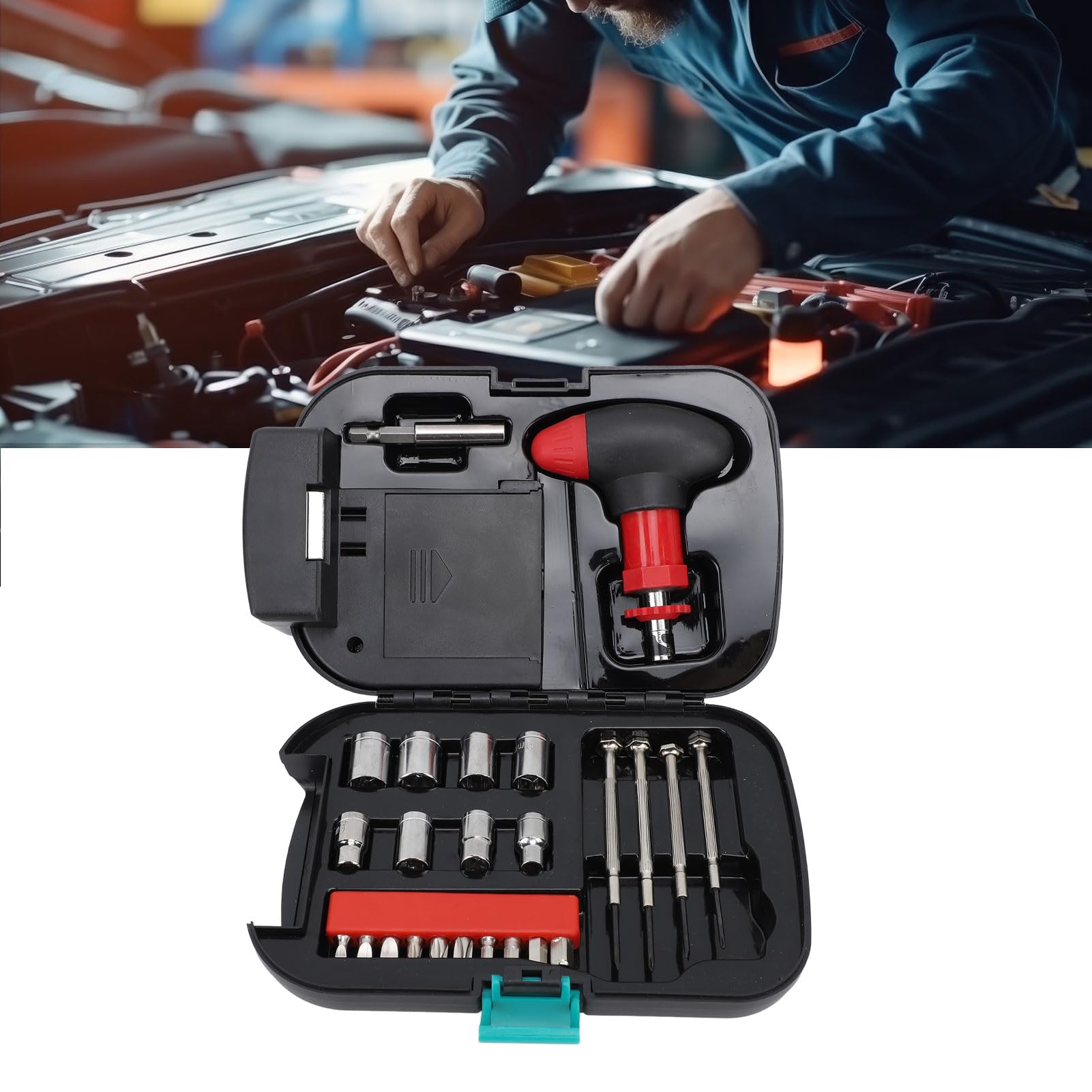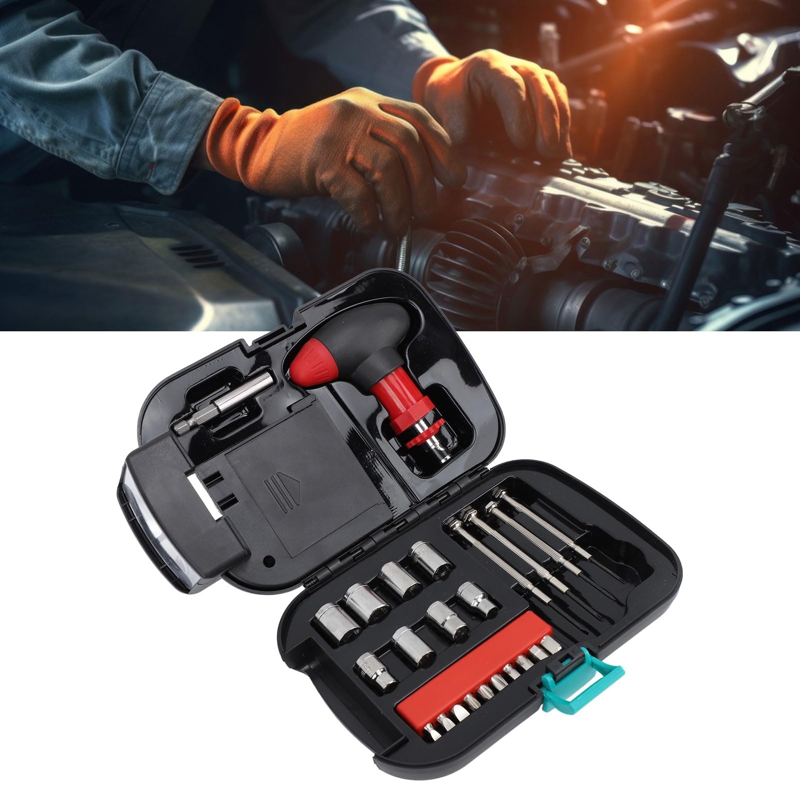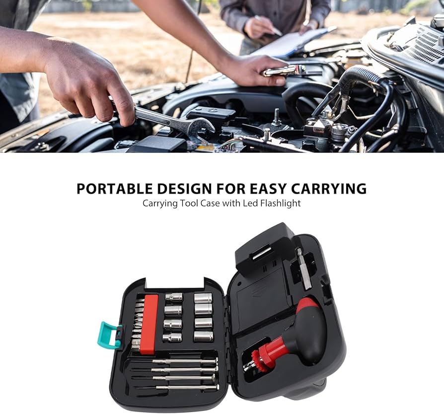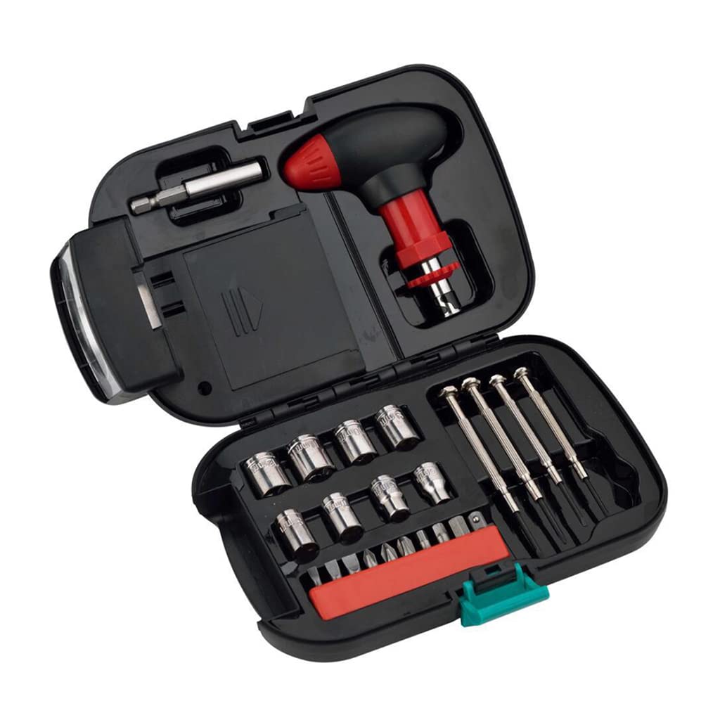 دارای : 9 سری پیچ گوشتی / 8 سری آچار بکس / 4 عدد پیچ گوشتی ساعتی / دوتبدیل بلند و کوتاه / دسته جغجغه ای / چراغ قوه اضطراری