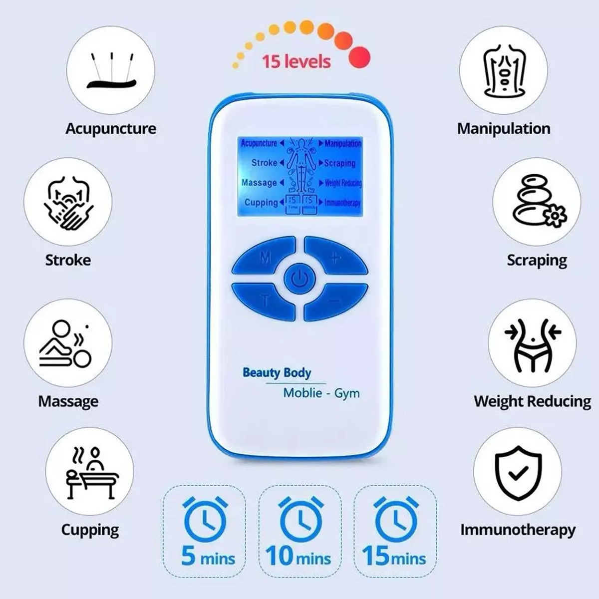 2. این دستگاه ماساژور فیزیوتراپی چند منظوره دارای هشت حالت ماساژ و 15 سطح شدت قابل تنظیم است تا بتوانید از یک ماساژ استادانه لذت ببرید و مراقب سلامتی خود باشید.