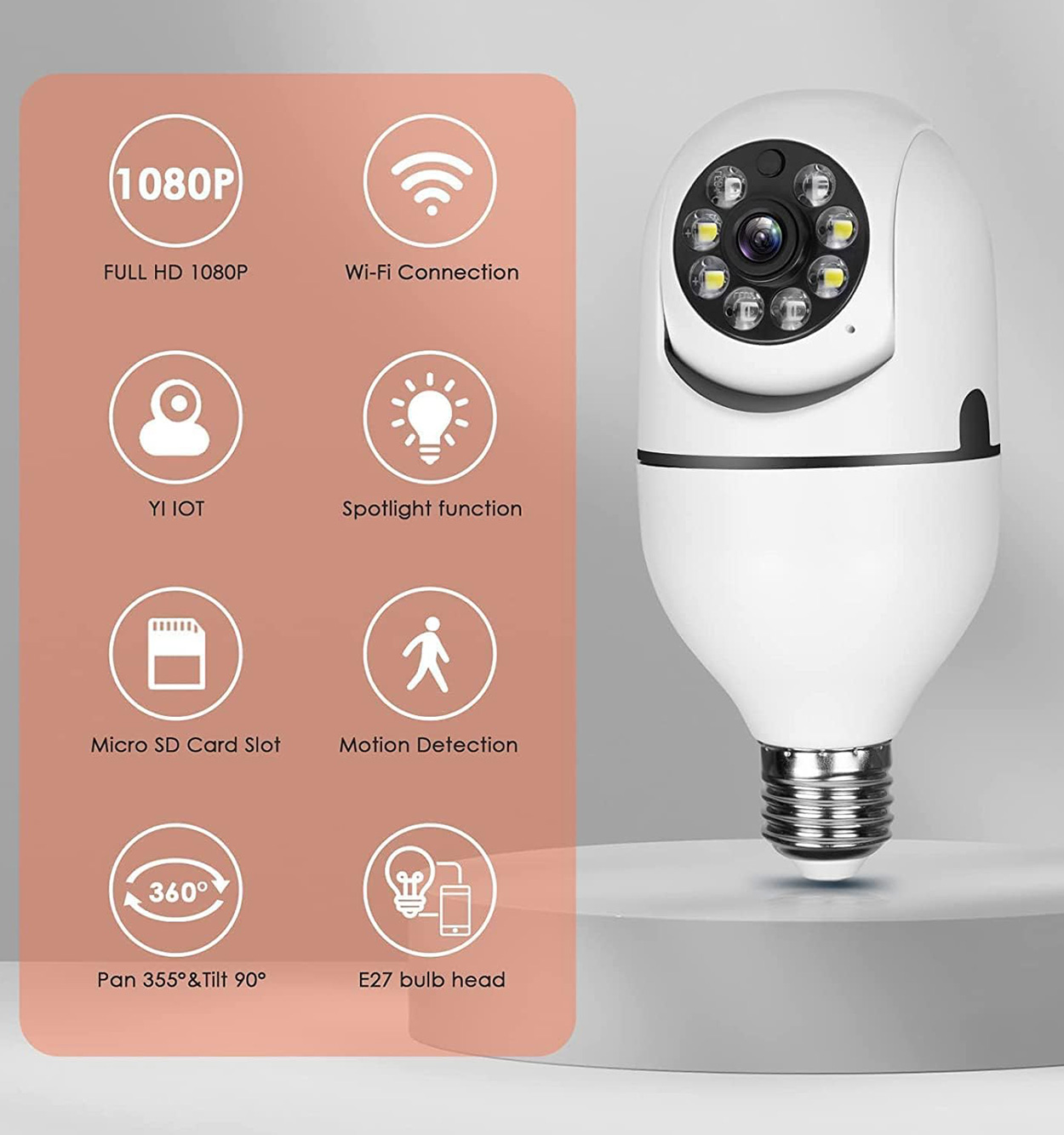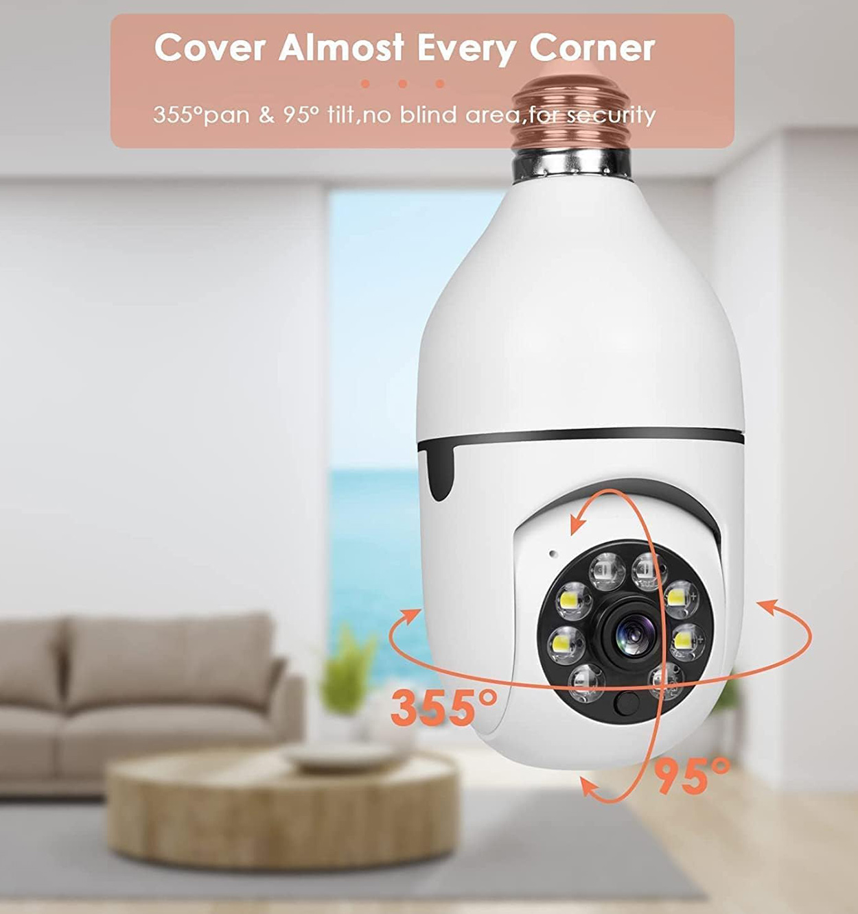 تصویر و چرخش دوربین لامپی تصویر دوربین لامپی چرخشی گردان از کیفیت Full-HD-1080 برخوردار است با لنز دوربین 2 مگاپیکسل که شما می توانید تا فاصله 35 متری را در روز به صورت واضح تشخیص چهره داشته باشید و در شب هم بین 15 الی 20 متر تصویر واضحی به شما می دهد. چرخش این دوربین هم به صورت 120 درجه عمودی و 360 درجه به صورت افقی می باشد. دوربین مداربسته لامپی با اپلیکیشن های v380s , v380 و v380 pro بر روی اندروید , ای او اس , بلک بری و . . . کاملا سازگار است . از جمله ویژگی های کاربردی دوربین مداربسته لامپی امکان مشاهده تصاویر به صورت زنده و ضبط شده بر روی اپلیکیشن است . قیمت دوربین طرح لامپ بسیار مقرون بصرفه بوده و آن را به یکی از مناسب ترین انتخاب ها برای اشخاصی که به دنبال خرید دوربین نظارتی برای خانه خود هستند، تبدیل نموده است.