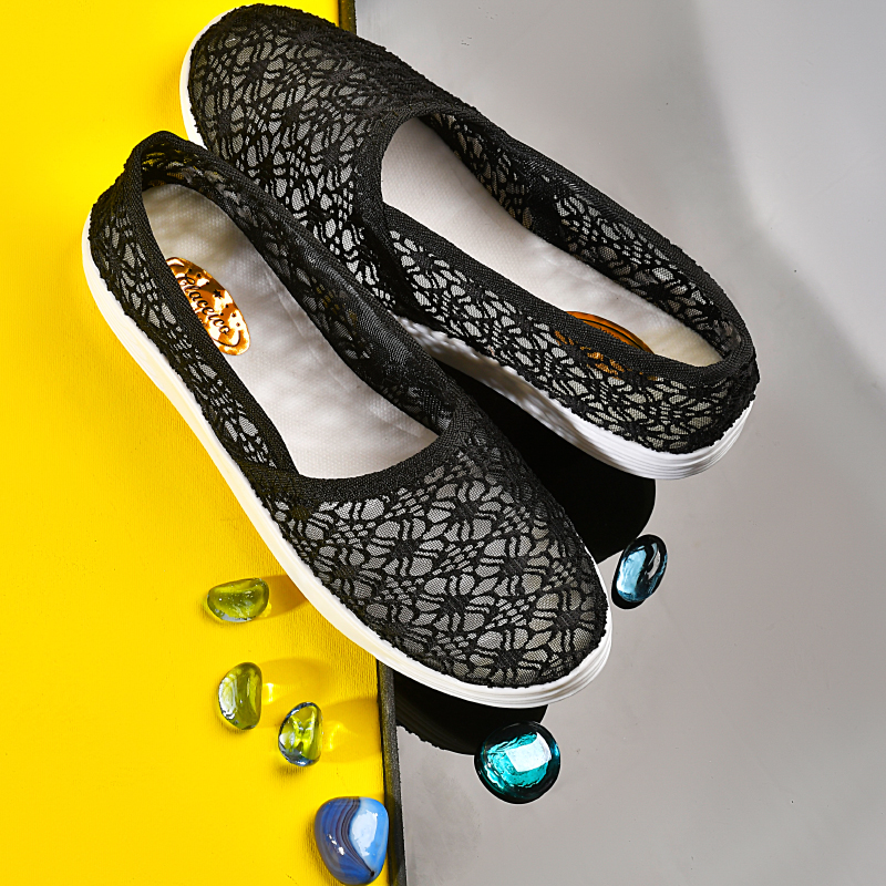 جنس قسمت رویی کفش از پارچه ی دانتل دارای طرح گل می باشد که به آن زیبایی خاصی بخشیده است. رنگ کفش مشکی است که به آن حالتی دخترانه داده است.کفی این کفش یک سانتی متری و از جنس پلاستیک فشرده می باشد.دارای استایل نیمه رسمی و مناسب برای استفاده روزمره و ومهمانی های دوستانه می باشد.